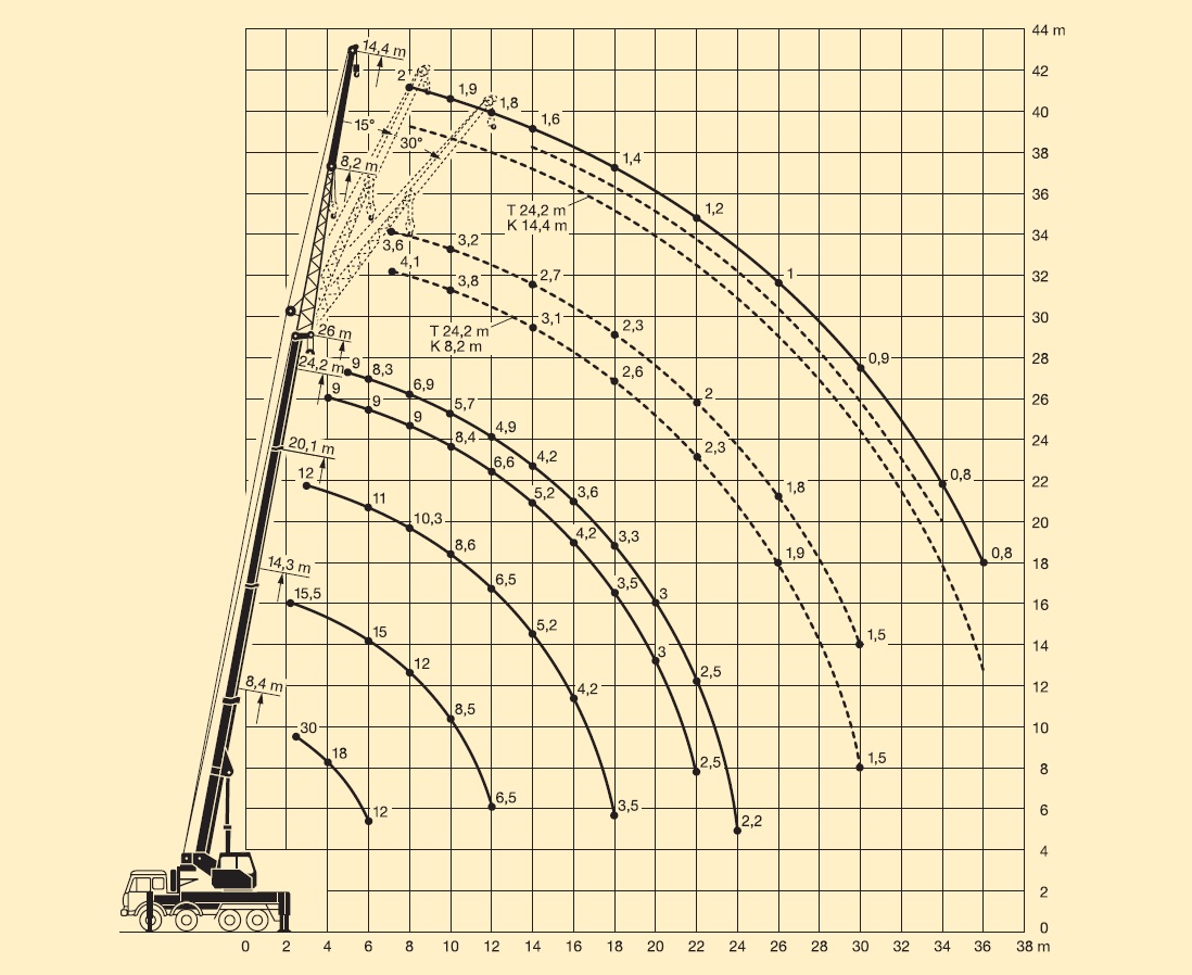 Грузоподъемность: 30 тонн Длина стрелы: 26 +9 м Цена: 21 000 руб.