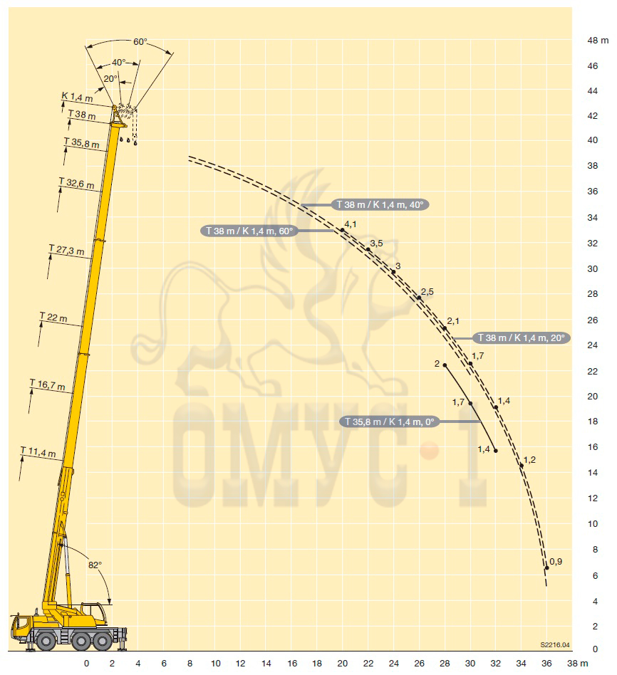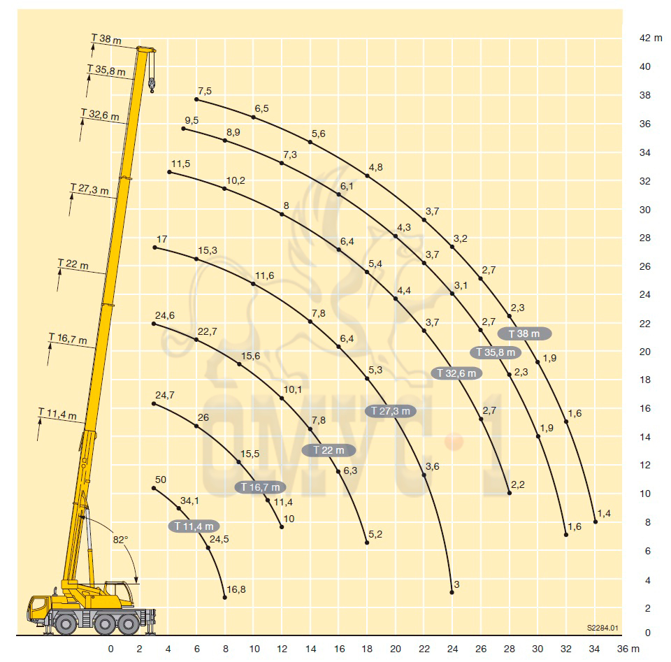 Грузоподъемность: 50 тн Длина стрелы: 38 м Цена: 21 000