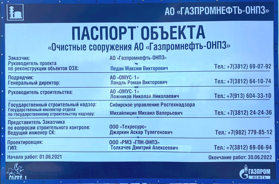Название объекта: Строительно-монтажные и пусконаладочные работы по объекту «Очистные сооружения АО «Газпромнефть-ОНПЗ» (Блок обработки осадка и нефтешлама, Сети внутриплощадочные). Заказчик: АО "Газпромнефть-ОНПЗ" Местонахождение: г. Омск Сдача в эксплуатацию: 2023 г. Руководитель строительства: